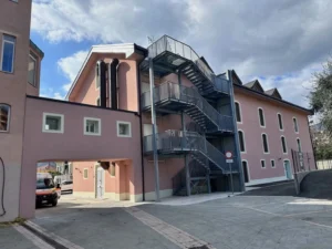 Edificio a quattro piani con pianta a “T”: piano terra con reception, uffici, salotto visitatori, salone ricreativo, palestra riabilitativa, ambulatorio, spogliatoi e sala per servizi alla persona. Primo e secondo piano con sala pranzo, soggiorno e nucleo da 20 posti (10 camere doppie). Sottotetto con quinto nucleo (12 posti in 6 camere doppie) per autosufficienti. Camere con bagno per disabili, letti motorizzati, tapparelle domotiche, sistema di chiamata e sensori antincendio. Due bagni assistiti per piano. VMC e climatizzazione ottimizzate per sicurezza e comfort. Corpo di collegamento con la struttura esistente.